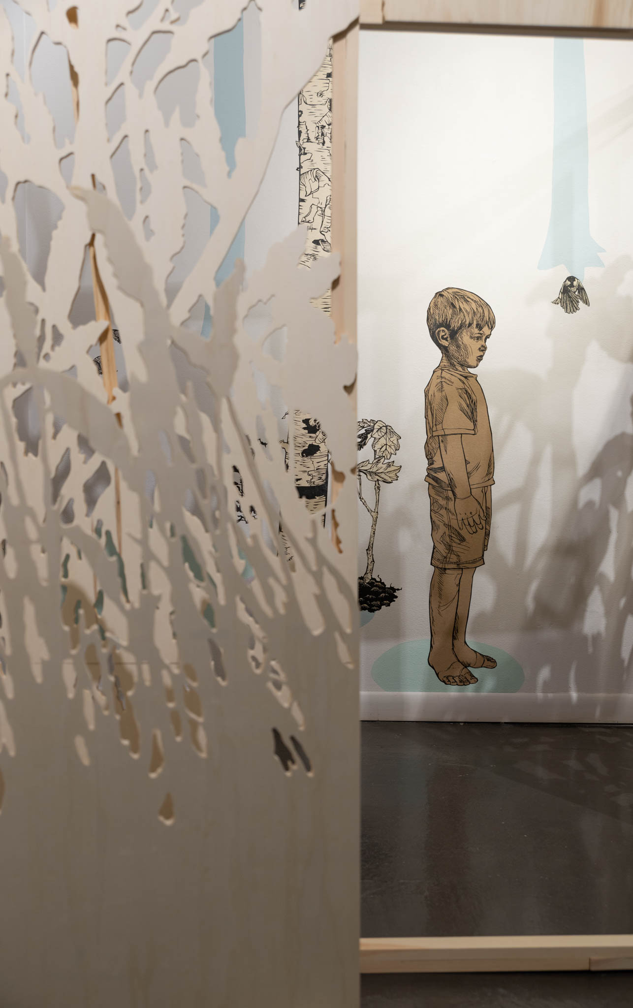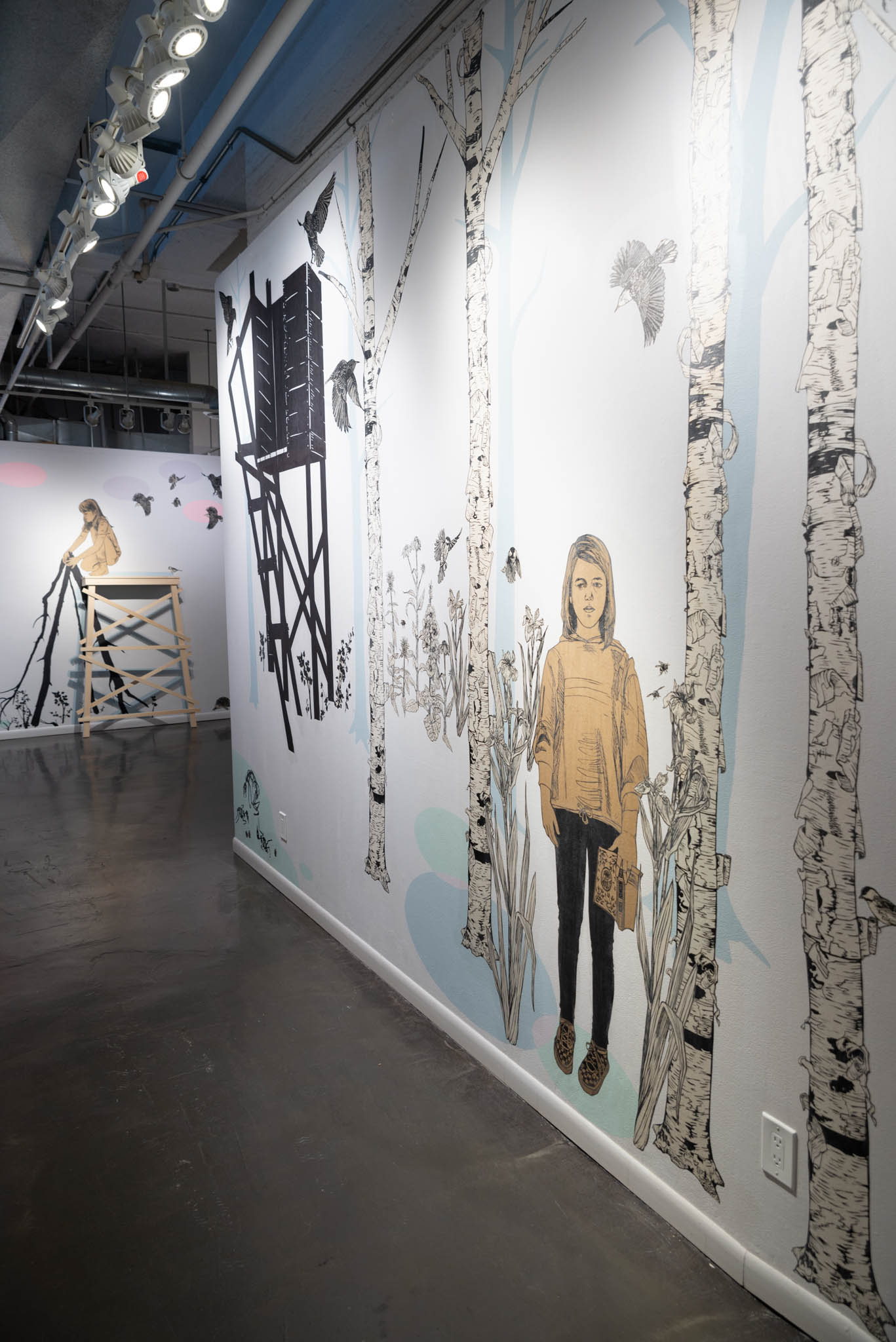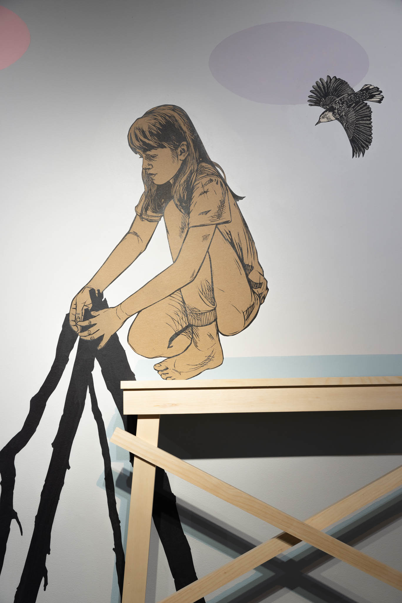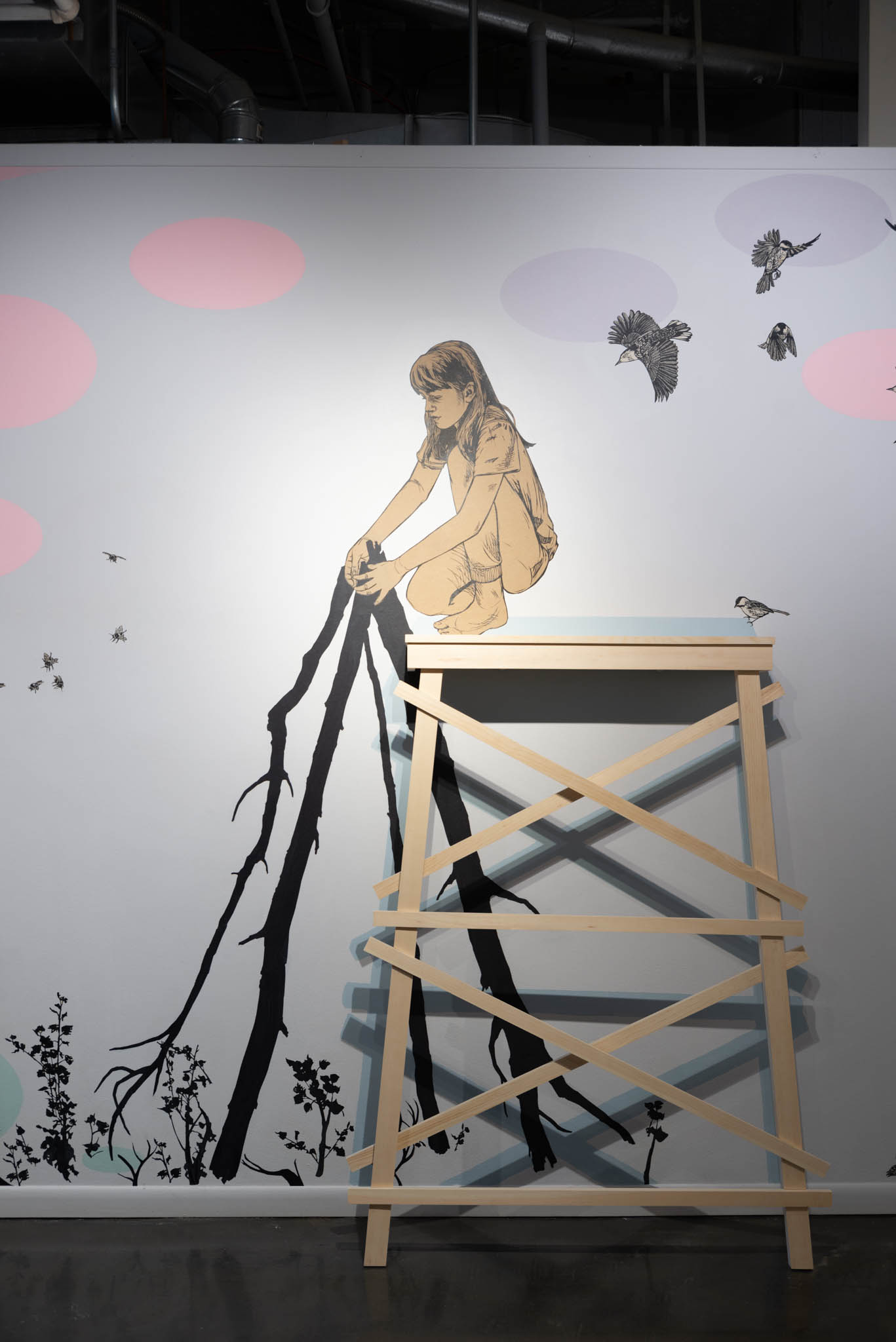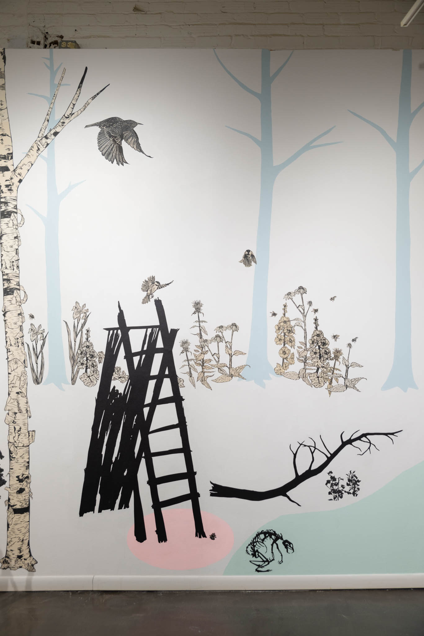 The exhibition takes an immersive form, with life-sized prints and painted imagery as mural components, and structural imagery emerging from the walls like a pop-up book at human-scale. Rich with layers and detail, Keeping Time invites viewers to experience the work in the way they may have become lost in books or illustrations as a child.