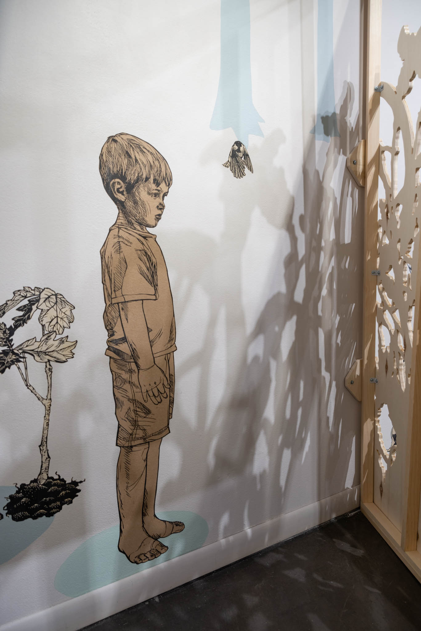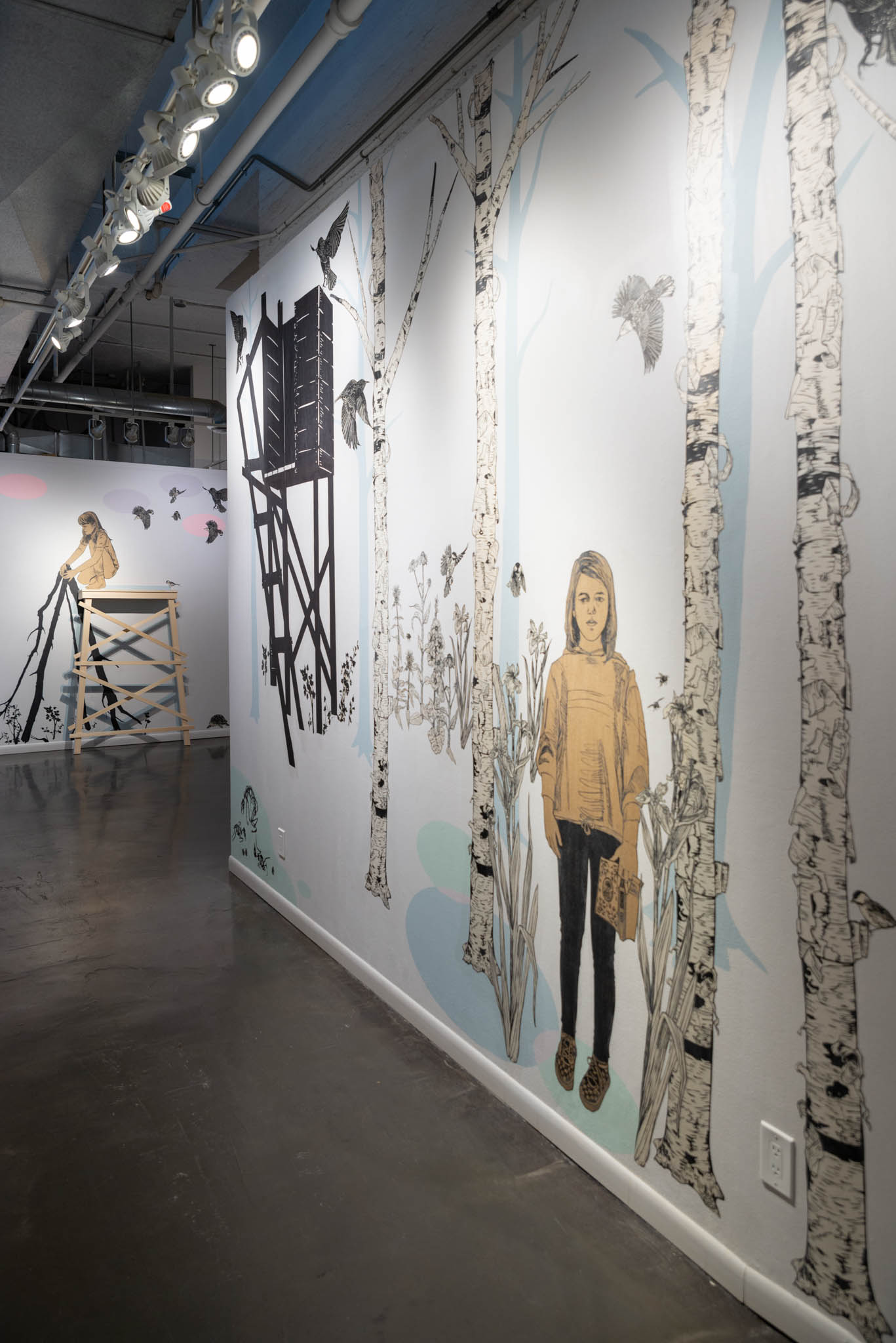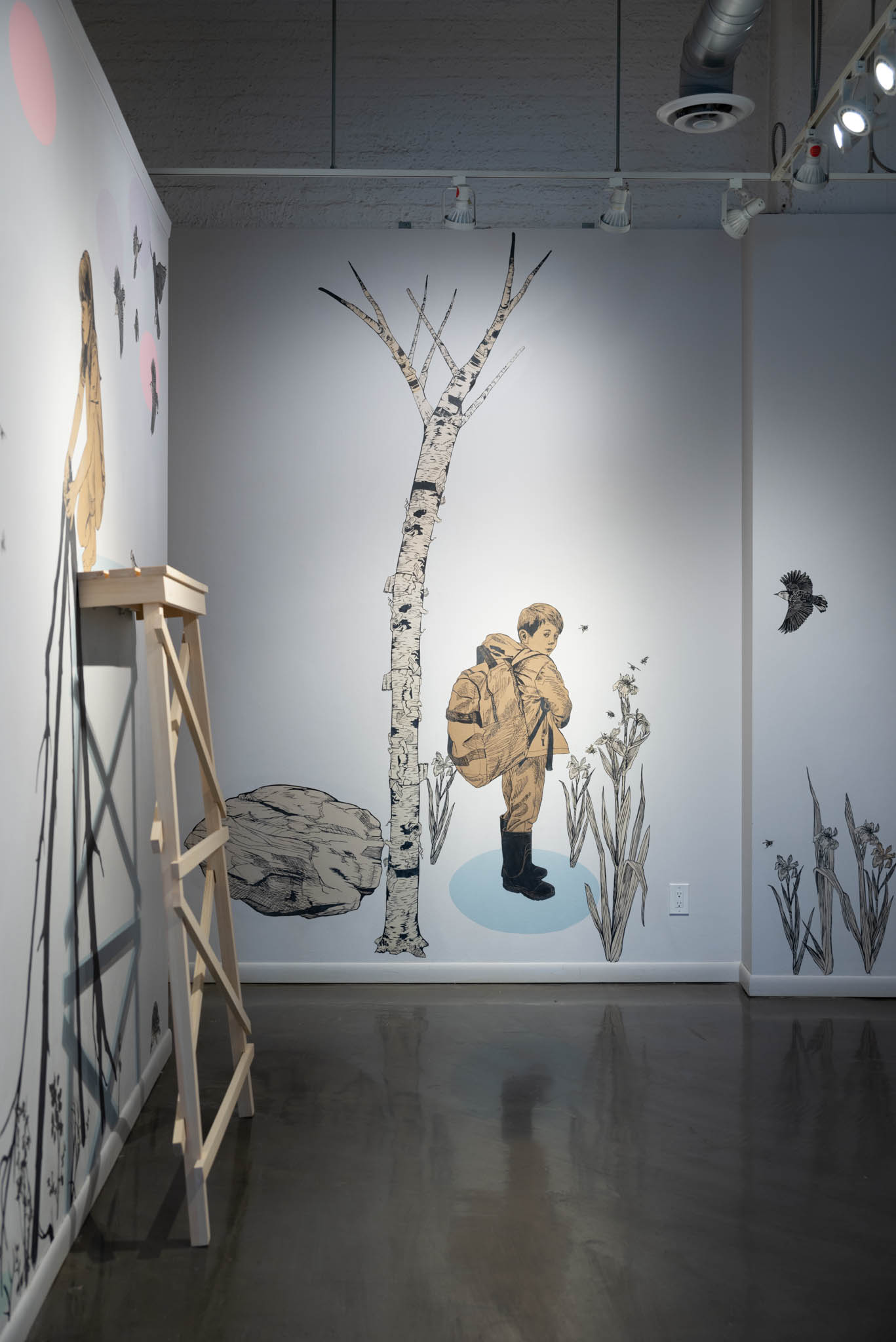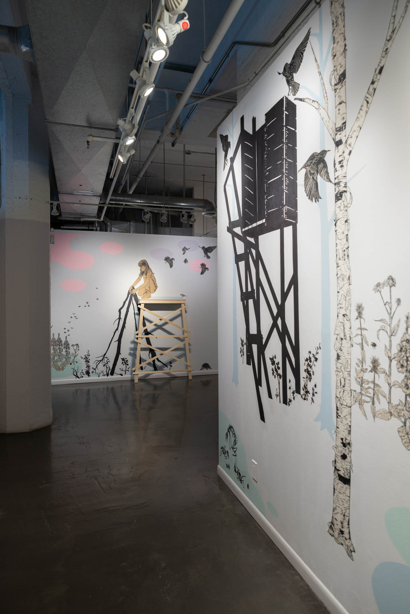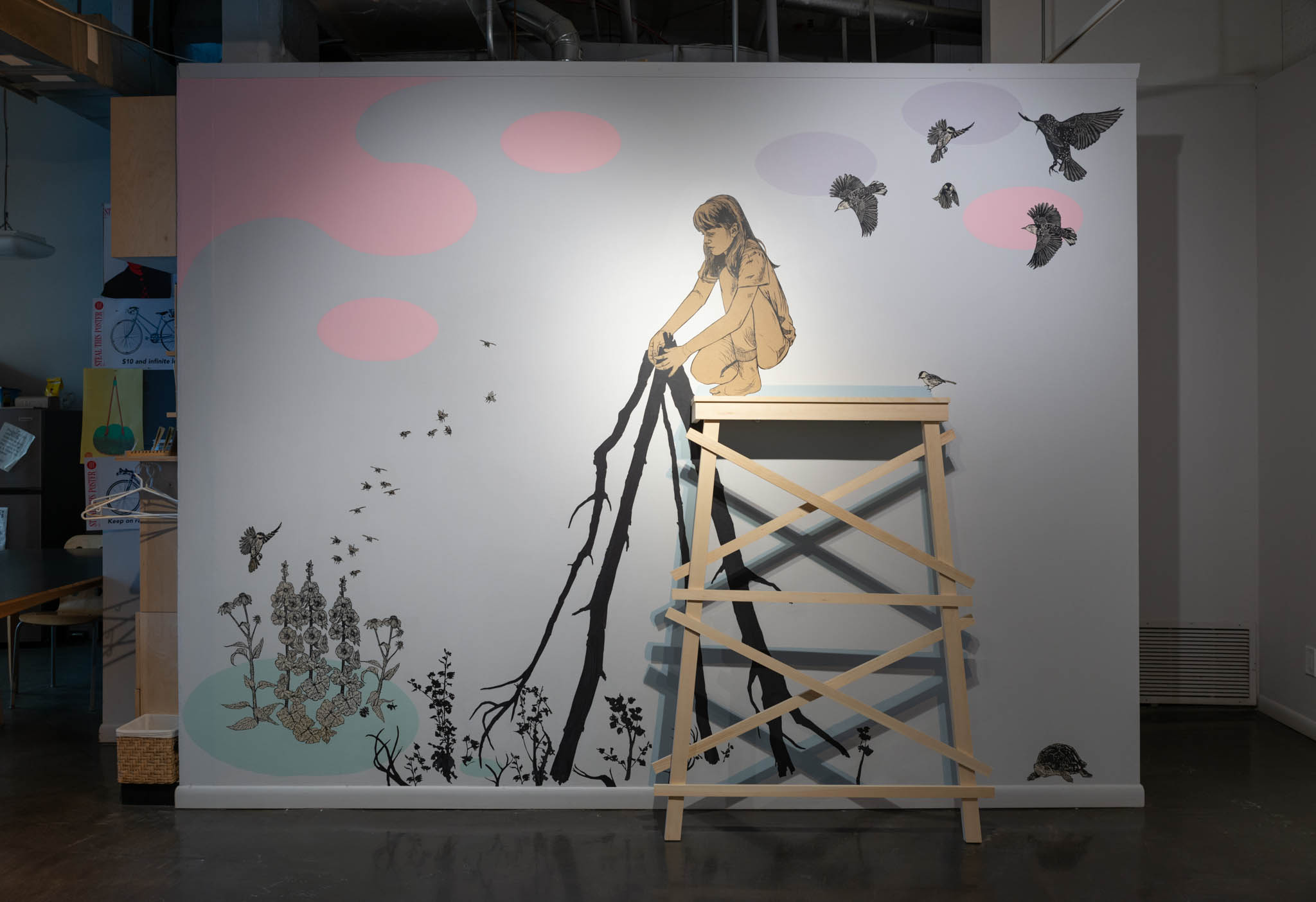 The exhibition takes an immersive form, with life-sized prints and painted imagery as mural components, and structural imagery emerging from the walls like a pop-up book at human-scale. Rich with layers and detail, Keeping Time invites viewers to experience the work in the way they may have become lost in books or illustrations as a child.