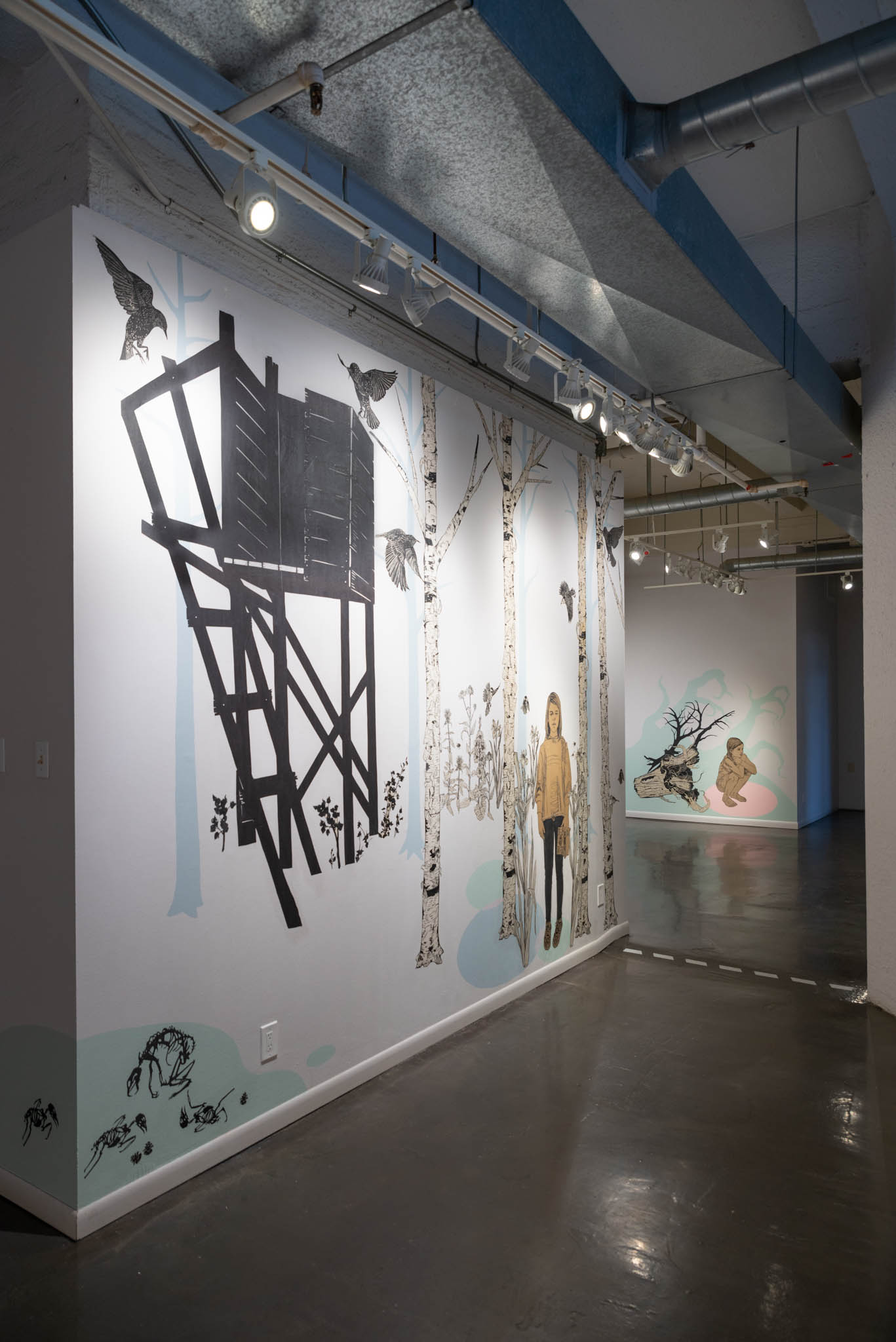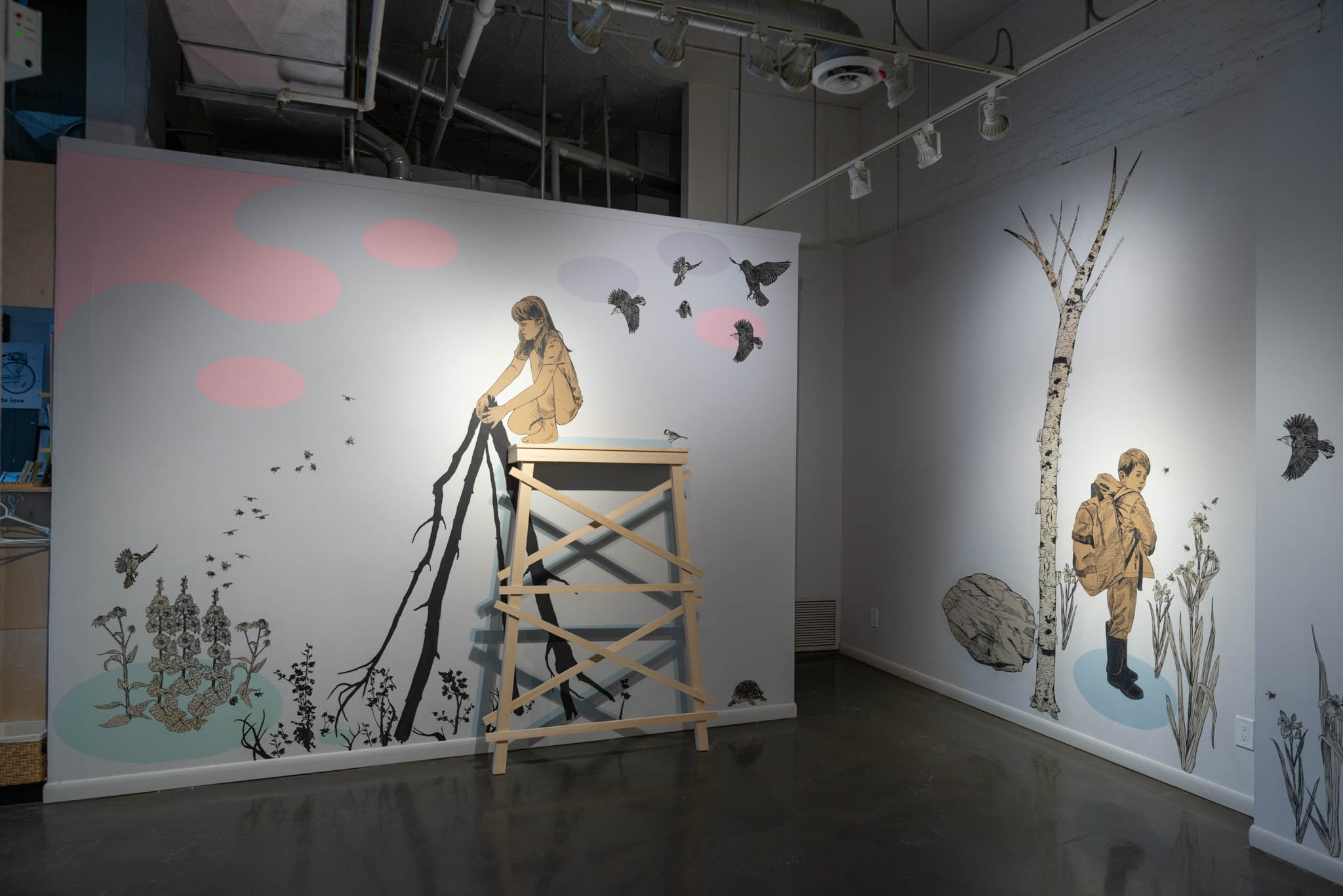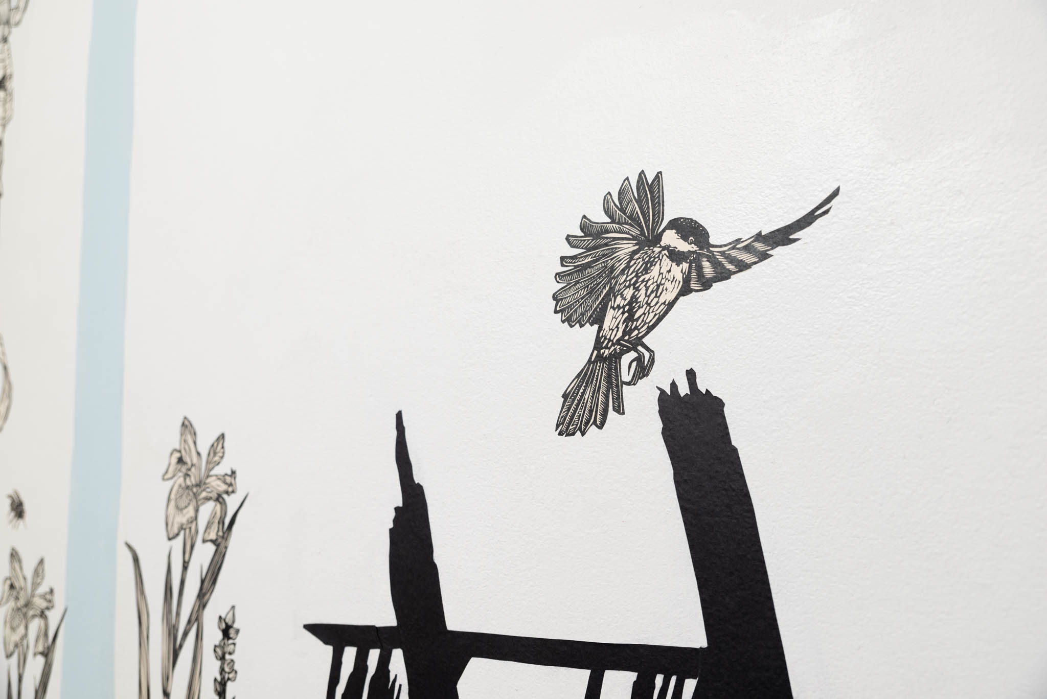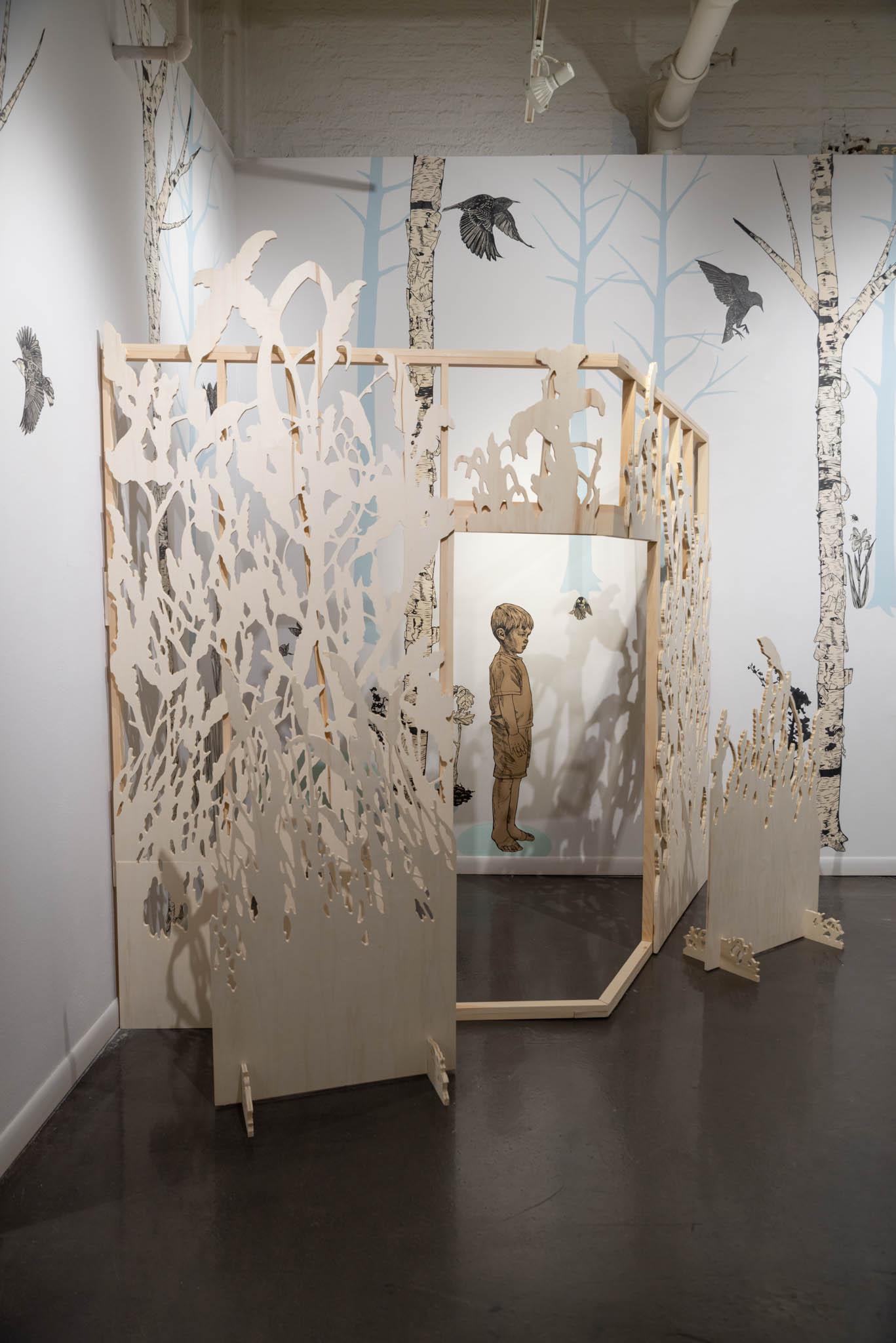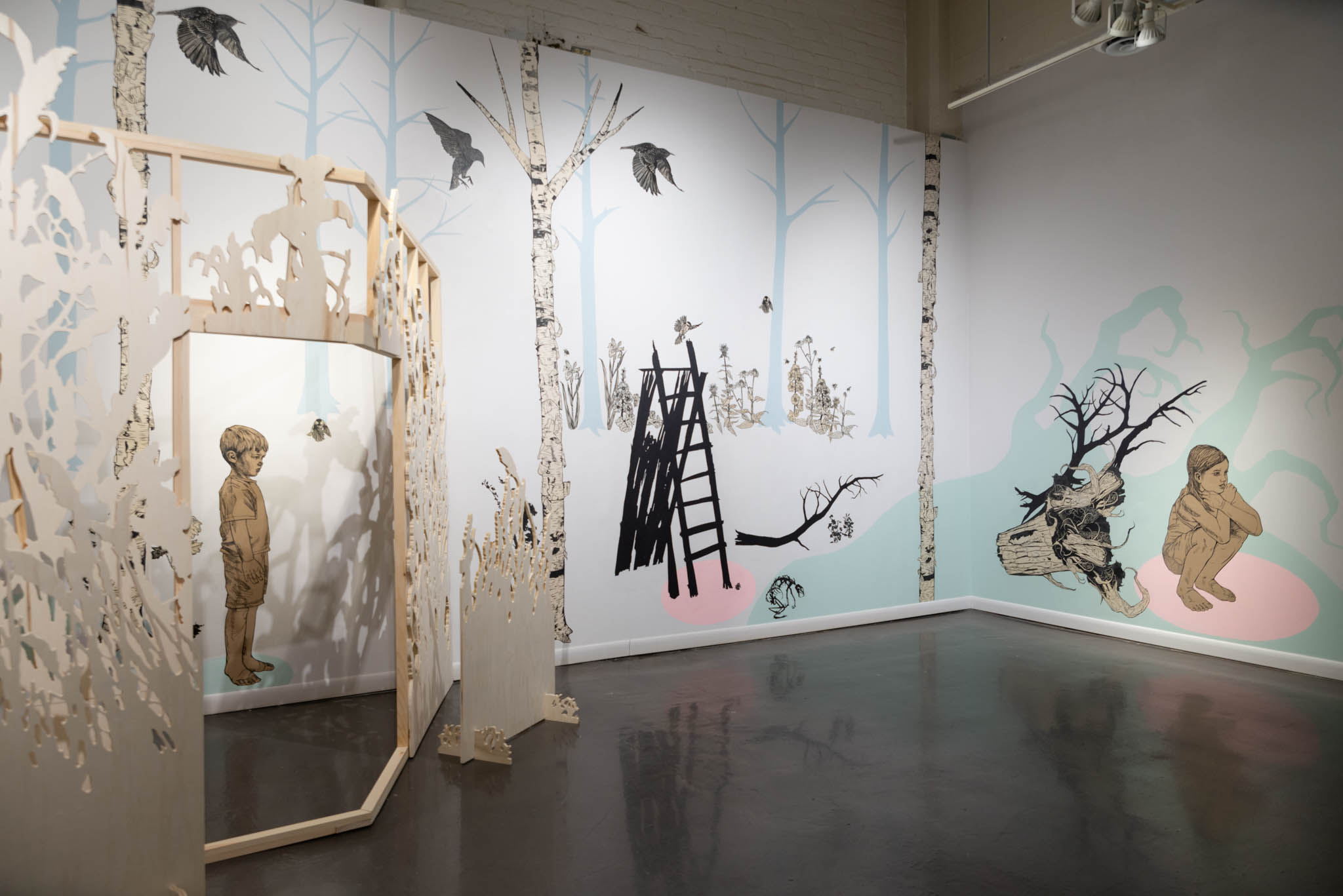The exhibition takes an immersive form, with life-sized prints and painted imagery as mural components, and structural imagery emerging from the walls like a pop-up book at human-scale. Rich with layers and detail, Keeping Time invites viewers to experience the work in the way they may have become lost in books or illustrations as a child.