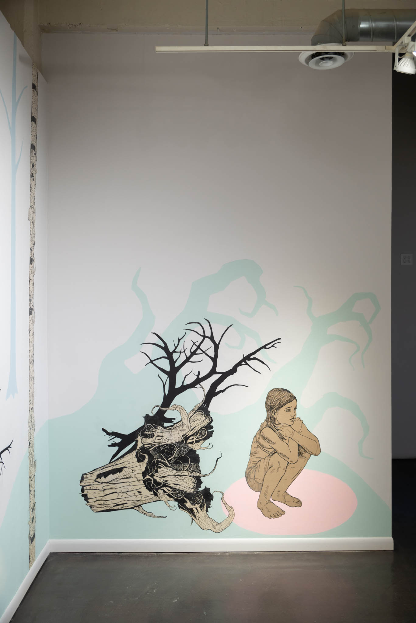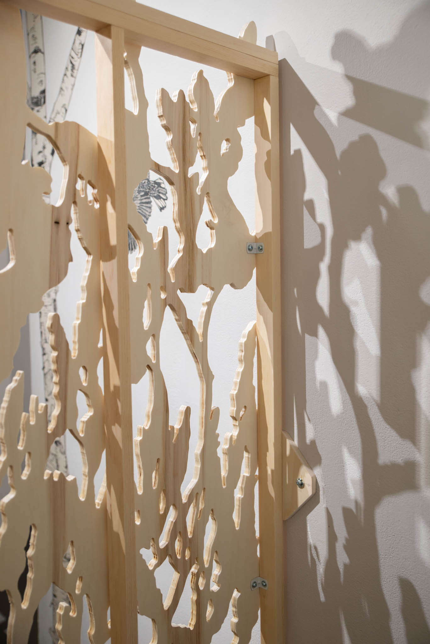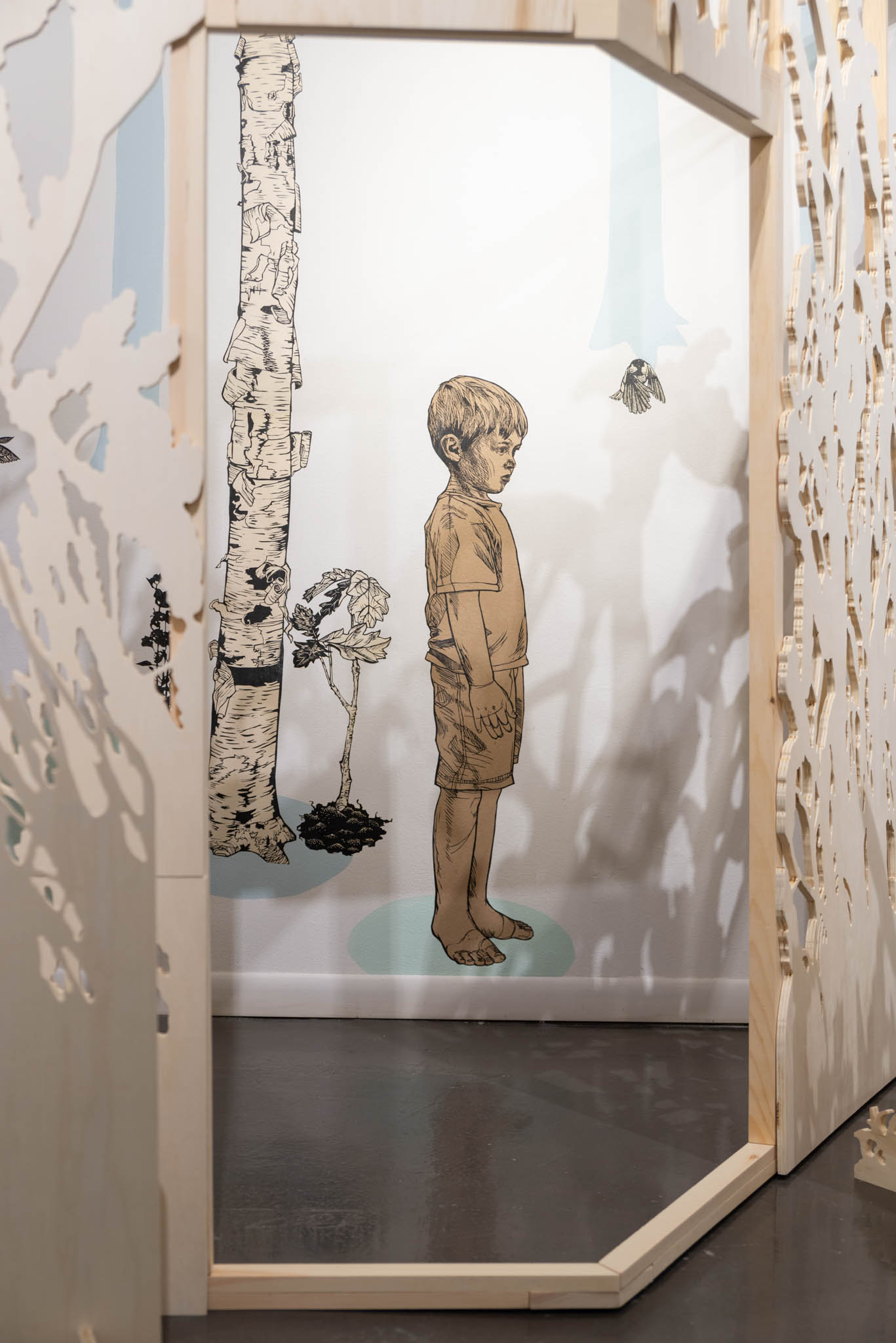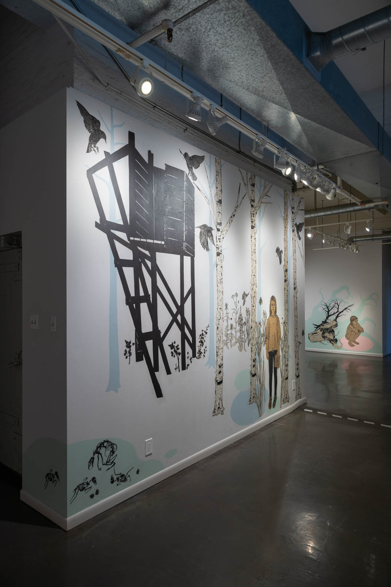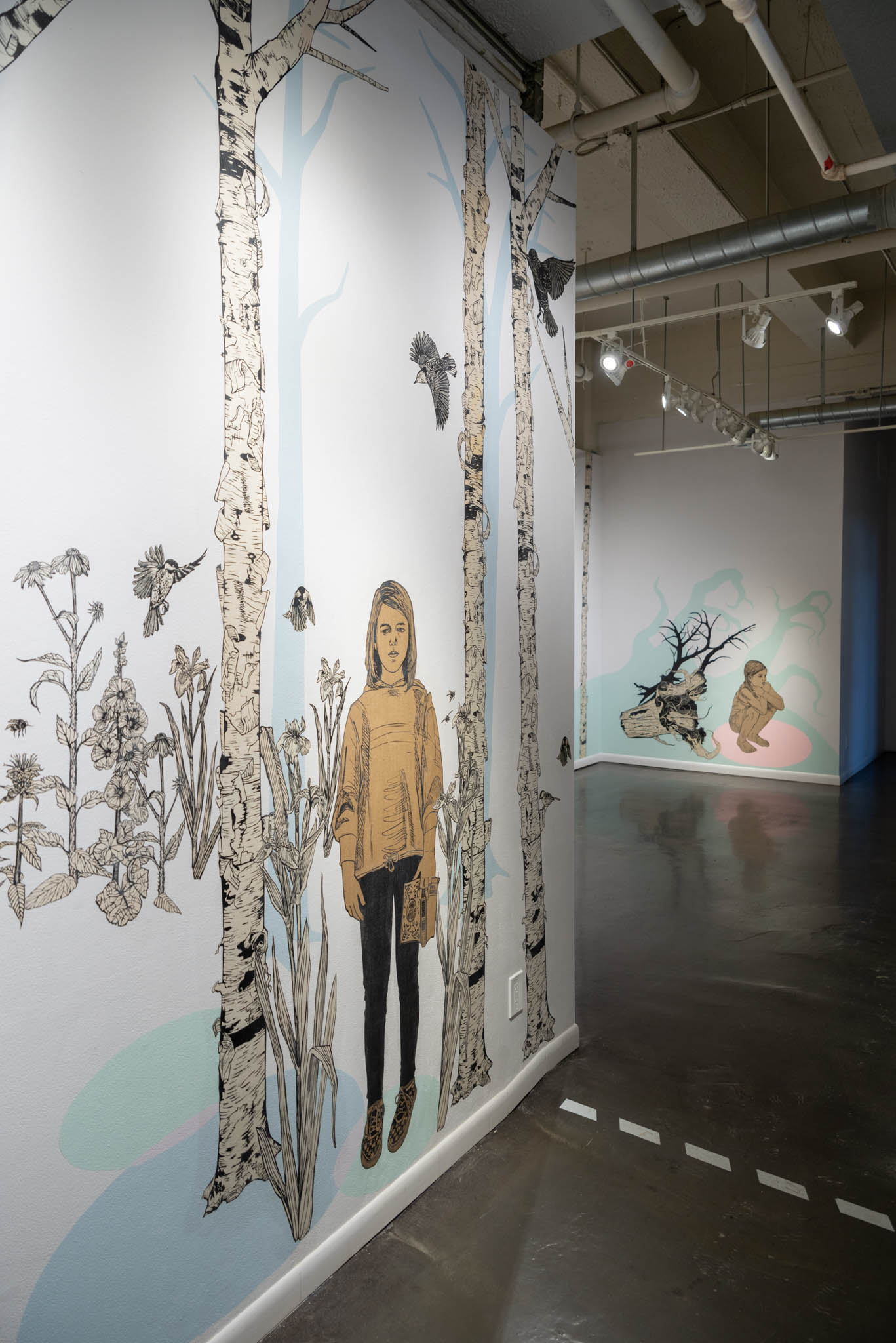The exhibition takes an immersive form, with life-sized prints and painted imagery as mural components, and structural imagery emerging from the walls like a pop-up book at human-scale. Rich with layers and detail, Keeping Time invites viewers to experience the work in the way they may have become lost in books or illustrations as a child.