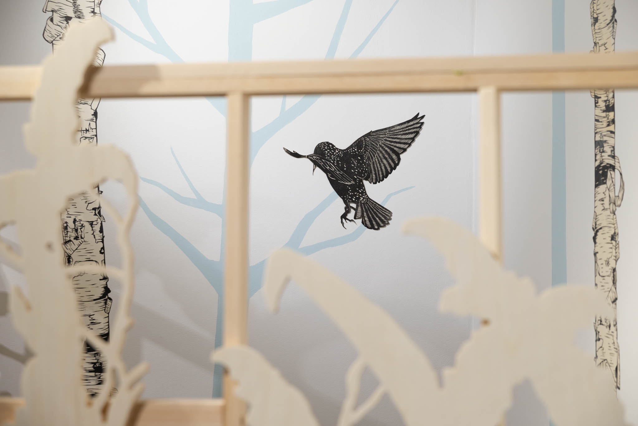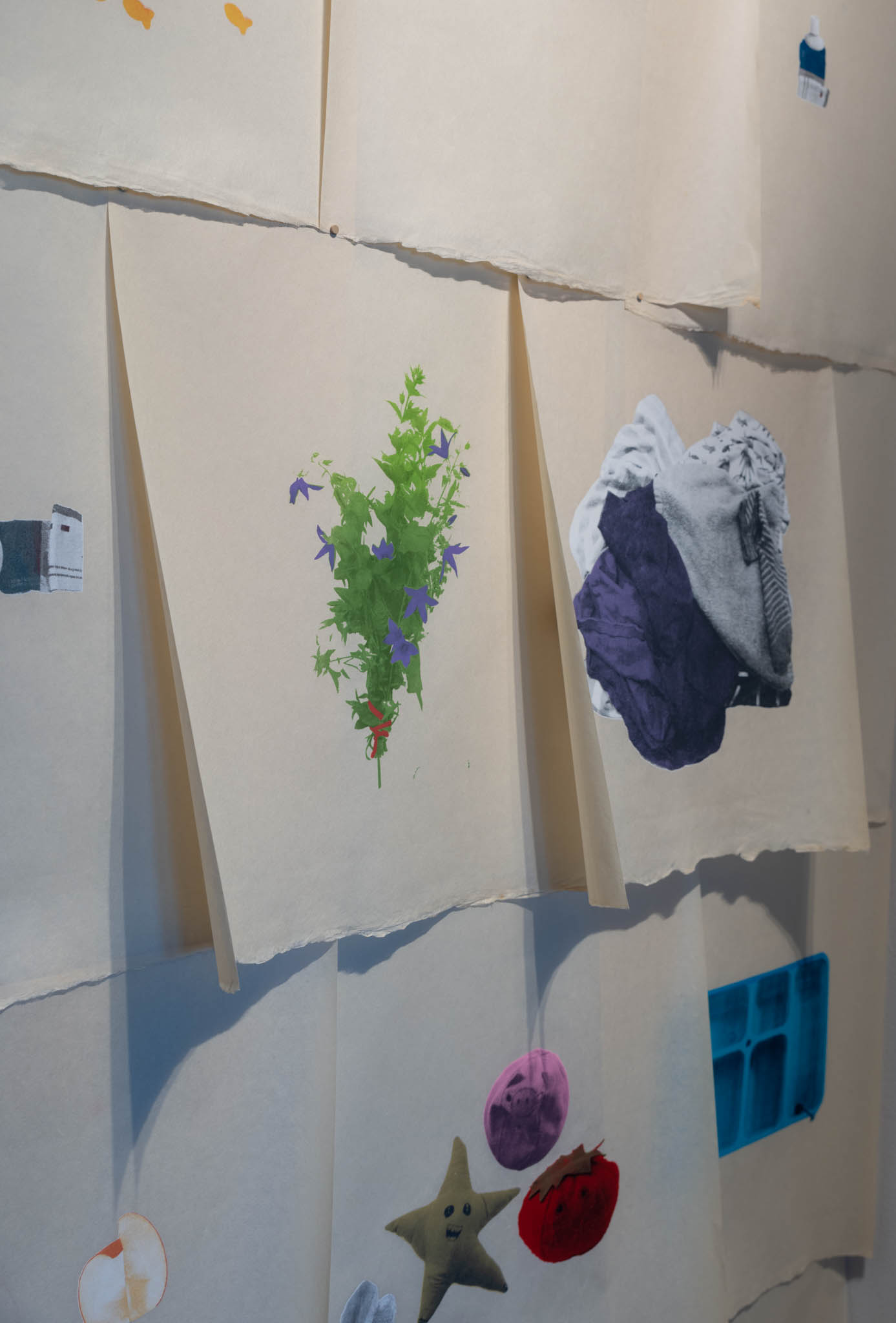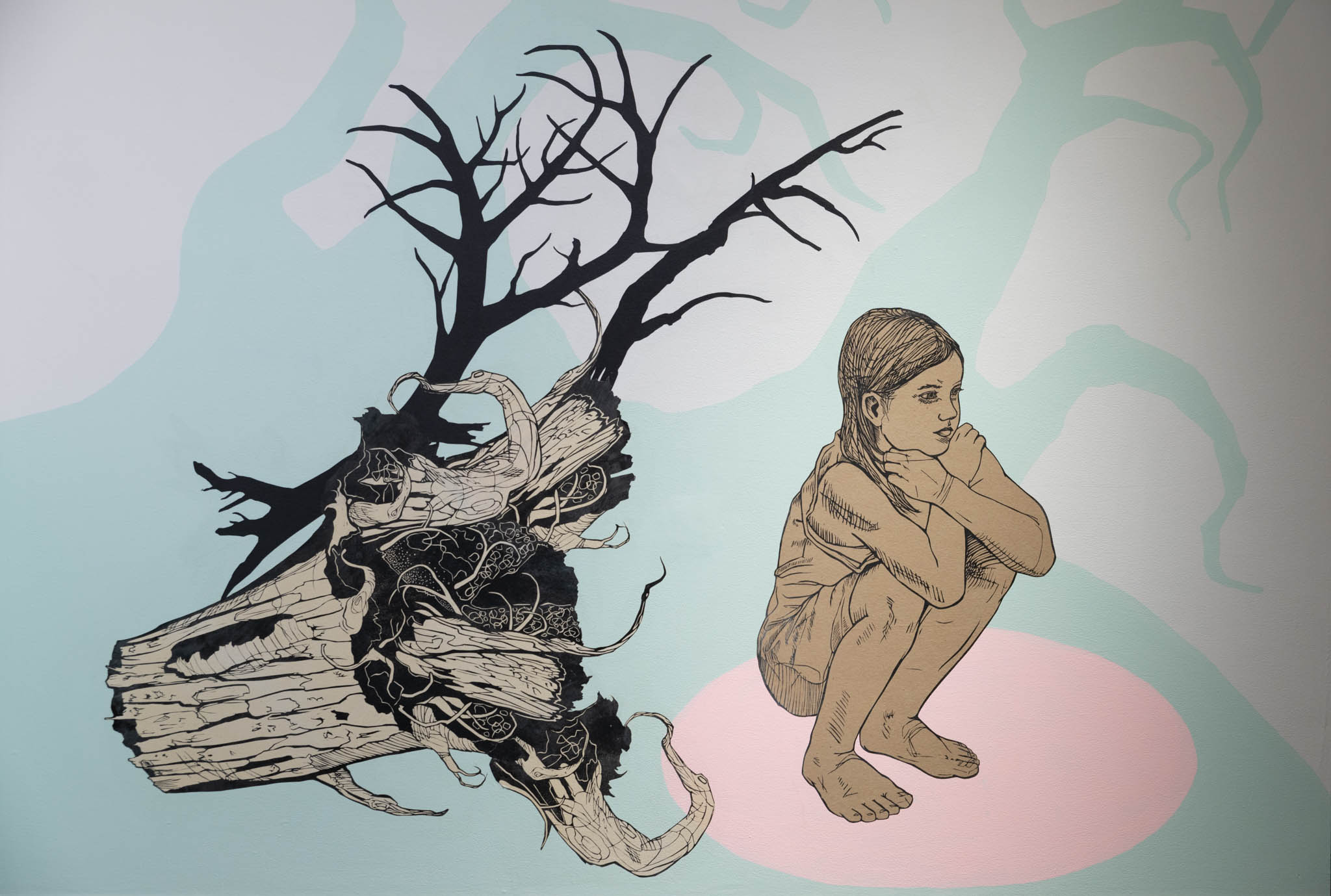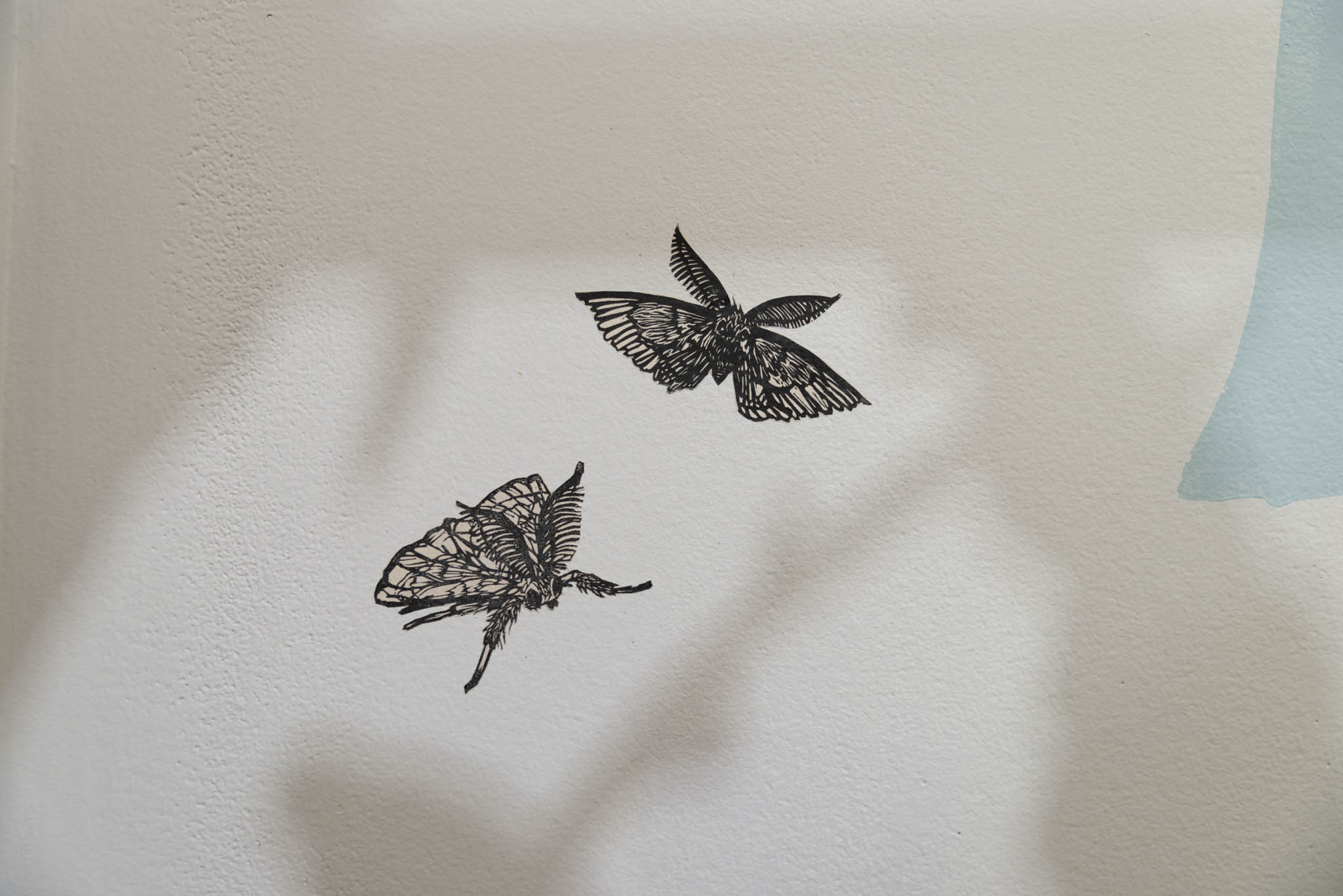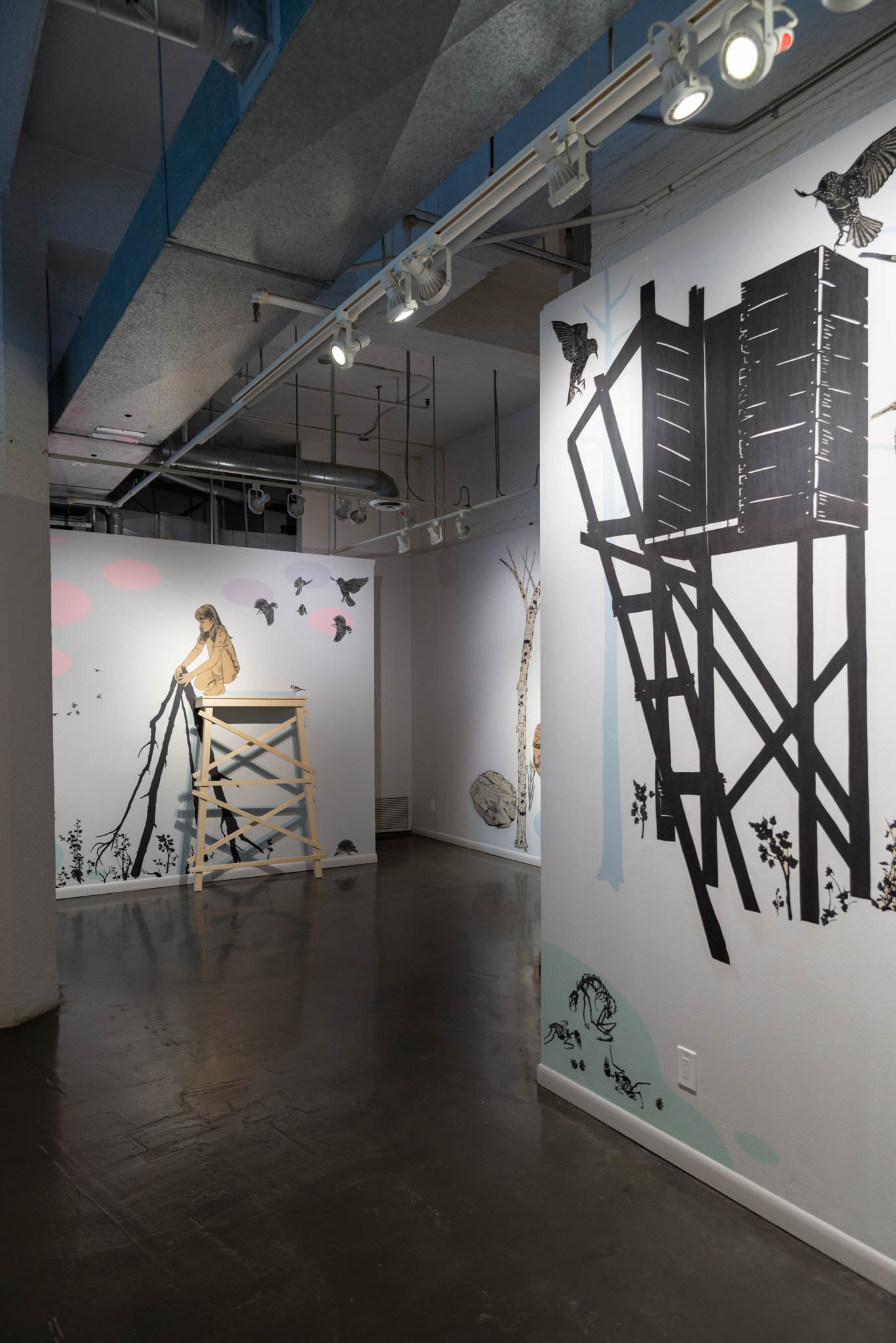The exhibition takes an immersive form, with life-sized prints and painted imagery as mural components, and structural imagery emerging from the walls like a pop-up book at human-scale. Rich with layers and detail, Keeping Time invites viewers to experience the work in the way they may have become lost in books or illustrations as a child.