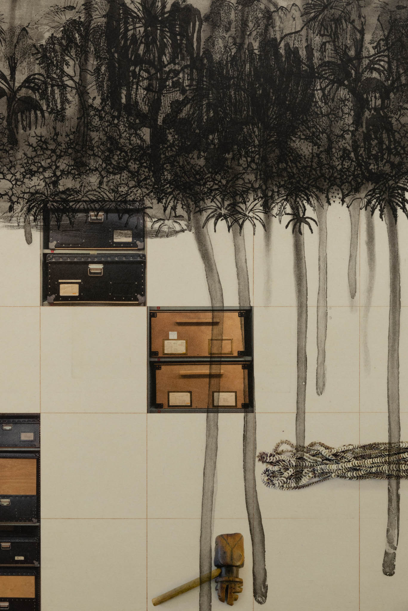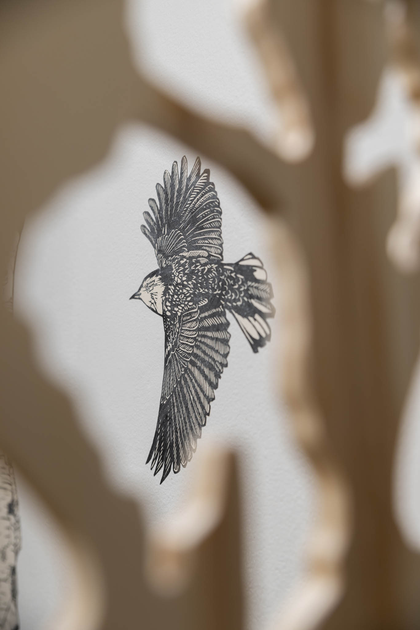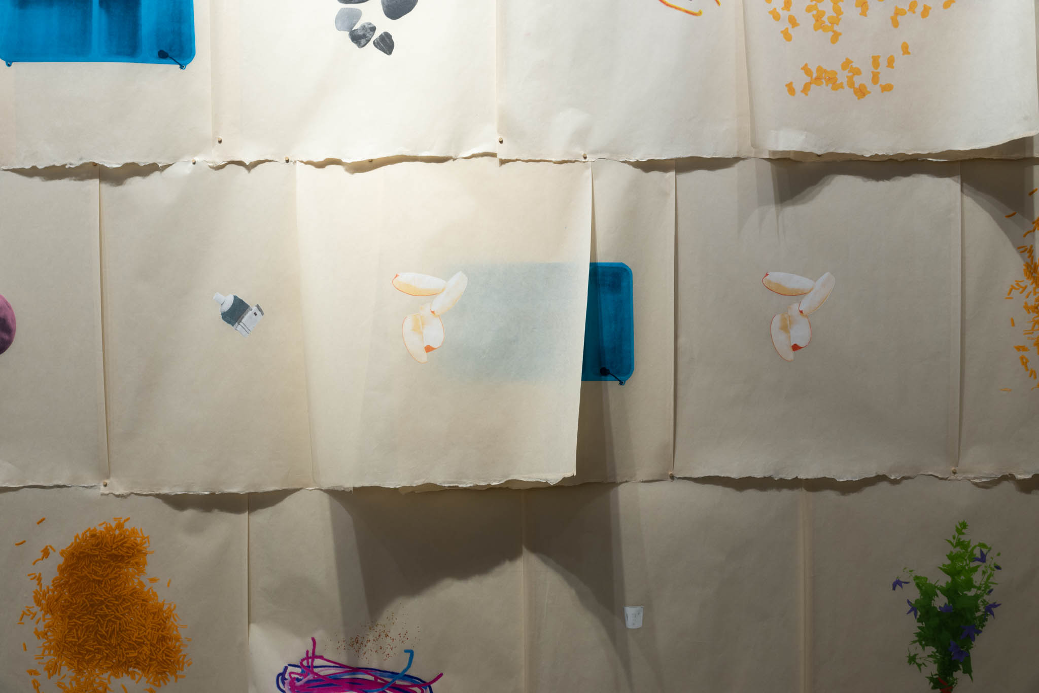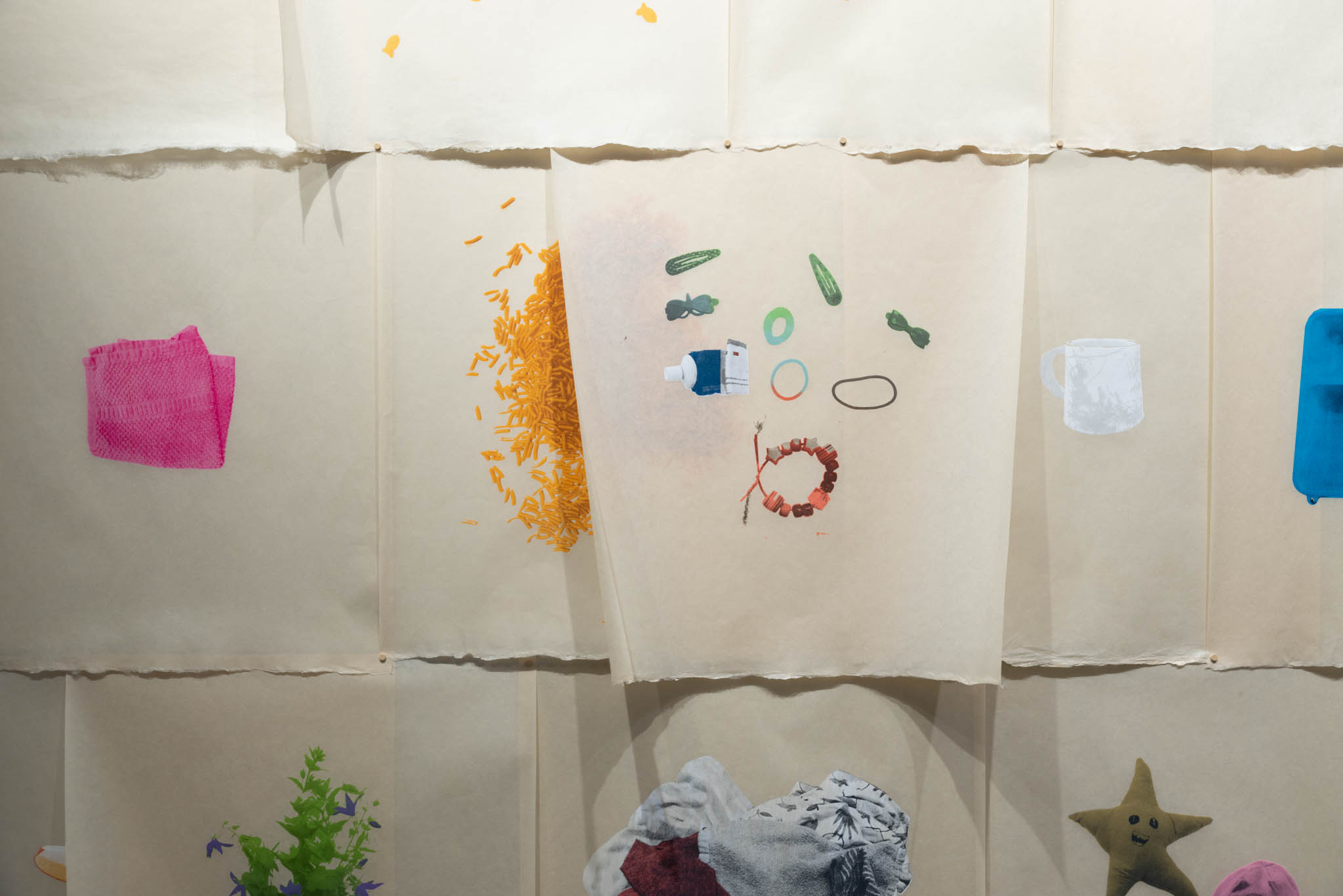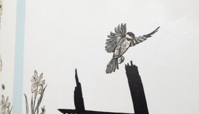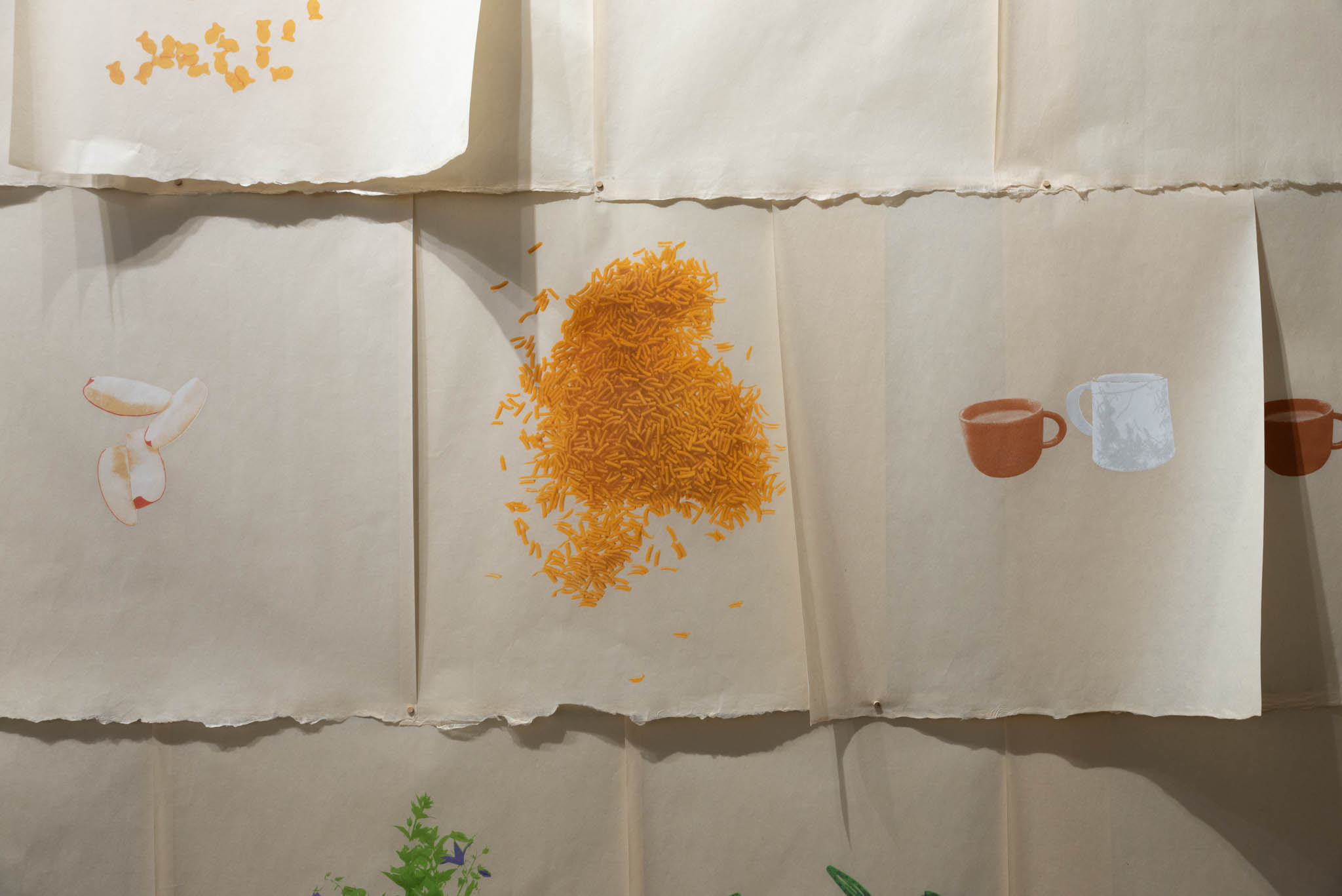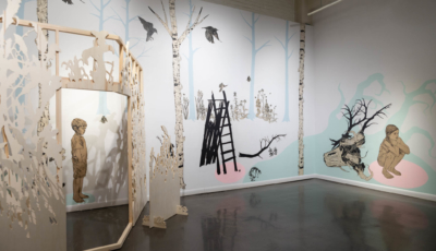 The exhibition takes an immersive form, with life-sized prints and painted imagery as mural components, and structural imagery emerging from the walls like a pop-up book at human-scale. Rich with layers and detail, Keeping Time invites viewers to experience the work in the way they may have become lost in books or illustrations as a child.