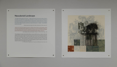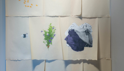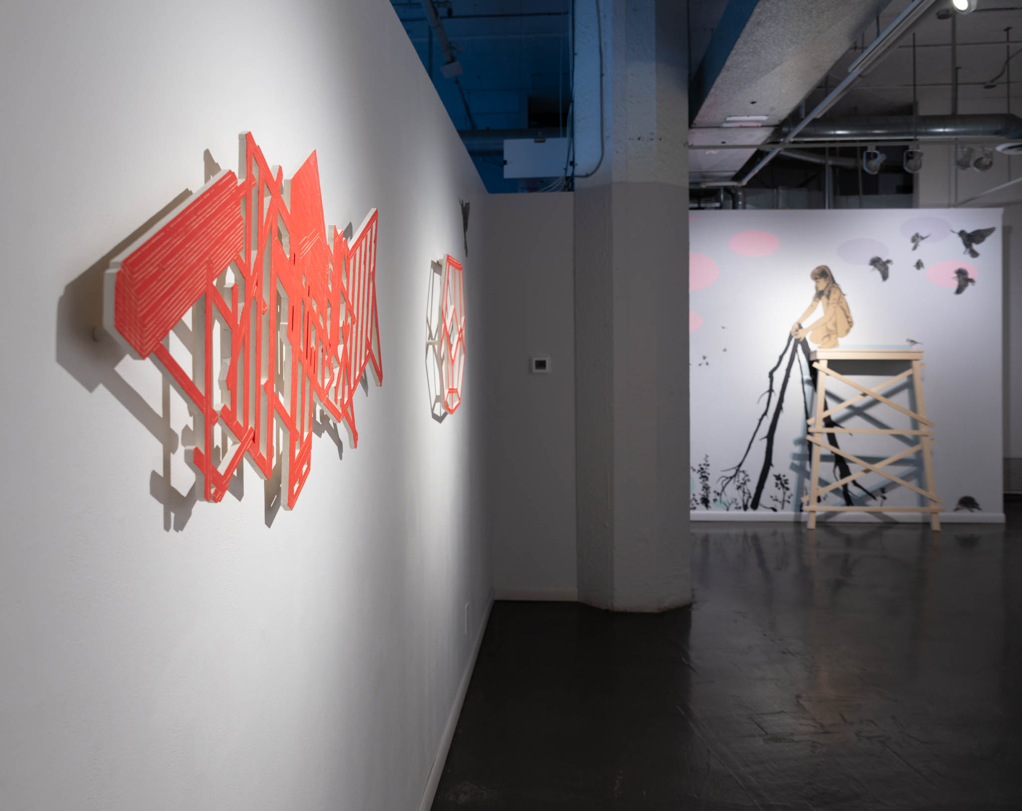 Laura Peturson and Andrew Ackerman’s duo exhibition is inspired by the artists’ experience as parents, collaging figures, natural subject matter such as birds and plant species, along with remnants from child-made forts and structures. These remnants, chosen for their potential to exist in multiple temporal states simultaneously, reference both a time of childhood, and impending adolescence. Originally, these structures provided a space of separation, that allowed for childhood independence and interiority. Their present and future deterioration reference the aging of the children who built them, as well as the constant and cyclical nature of the environment.