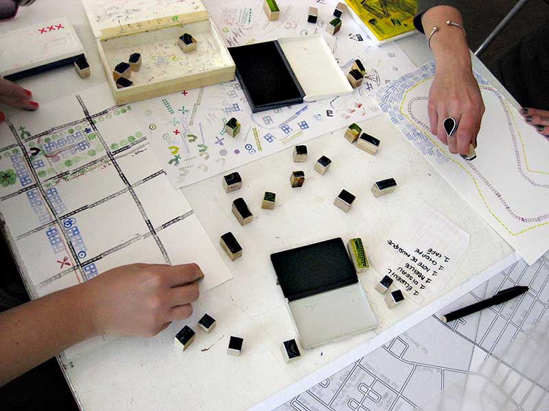 A social trail, also known as a desire path or desire line, is a landscape architecture term commonly used to describe a path created by use rather than design. In this social cartography inspired workshop, you will learn to trace and translate your own social trails into drawings. You will create a set of handmade stamps featuring signs and symbols reclaimed from the language of mapmaking. These stamps will constitiute an alphabet that can be employed to represent your personal territory; a framework for a succession of narratives and anecdotes, a pretext to connect with people while thinking about the ways we occupy, cross, share, and reinvent territories.